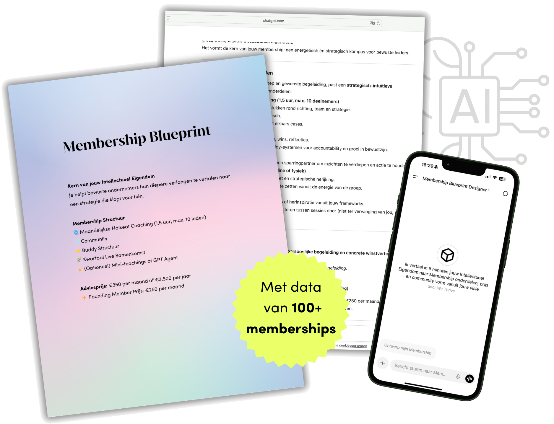 Dit is geen standaard GPT-Agent, maar een co-creatie waarin jouw unieke werkwijze, klant transformatie én data van meer dan 100 membership klanten samenkomen in jouw persoonlijke Membership Blueprint.
